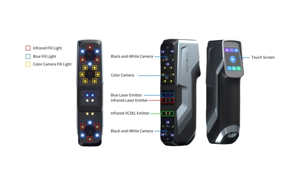 Key Features: Efficient scanning with 34 blue laser lines, Marker-free scanning with laser modes, Smart combination of large-area infrared speckle and partial fine scanning, Advanced hybrid alignment, Invisible light scanning, Easy scanning for black and reflective objects without spray, Outdoor scanning.